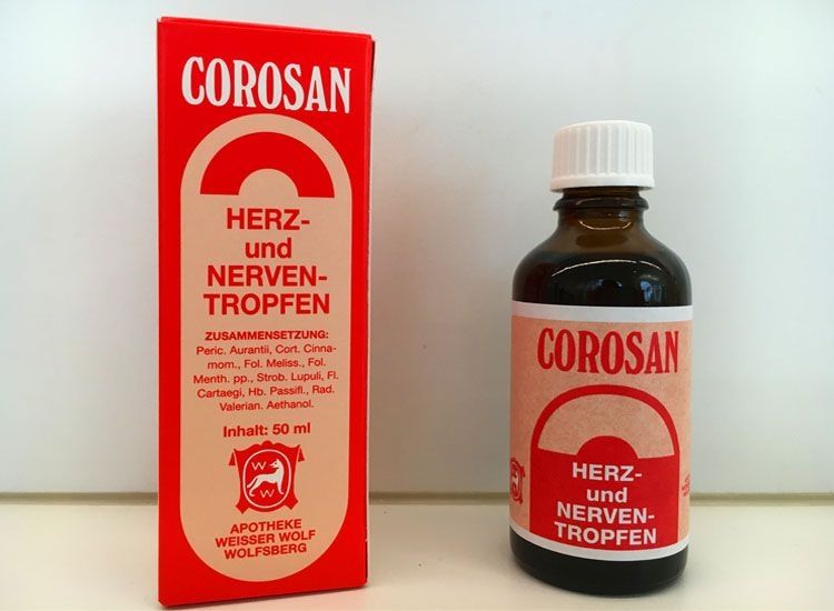 Dieser Pflanzenauszug aus altbewährten Heilkräutern wird bei organisch und nervös bedingten Herzbeschwerden angewendet. Corosan Herz- und Nerventropfen wirken auf das vegetative Nervensystem ausgleichend und beruhigend. Gleichzeitig ist eine blutdruckregulierende Wirkung festzustellen.