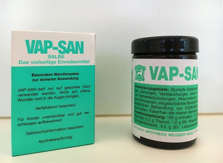 Vap-San ist ein hochwirksames Einreibemittel, das bei Rheuma, Ischias, Bandscheibenschäden, Muskelverspannungen, Arthrosen, Nervenentzündungen, Durchblutungsstörungen, Gliederschmerzen, Prellungen und Verstauchungen sowie zur Nachbehandlung von Unfallverletzungen verwendet wird. Es wirkt schmerzlindernd, entzündungshemmend und durchblutungsfördernd. Auch zur äußerlichen Behandlung von Erkältungskrankheiten wie Husten, Bronchitis, Schnupfen ist Vap-San sowohl als Brusteinreibung als auch zur Inhalation bestens geeignet.